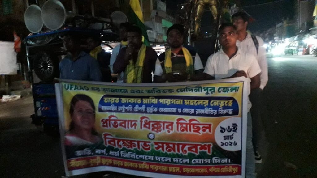 পশ্চিম মেদিনীপুর , নিজস্ব সংবাদদাতা:- রাষ্ট্রপতি দ্রৌপদী মুর্মুকে অবমাননা ও নোংরা রাজনীতির বিরুদ্ধে প্রতিবাদ জানিয়ে সোমবার সন্ধ্যায় পশ্চিম মেদিনীপুর জেলার গড়বেতা তিন নম্বর ব্লকের চন্দ্রকোনারোড শহরে প্রতিবাদ ধিক্কার মিছিল ও বিক্ষোভ ভারত জাকাত মাঝি পরগনা মহল। এই দিন গোটা শহর মিছিল পরিক্রমা করার পর অবশেষে শহরের প্রাণকেন্দ্রে অর্থাৎ চৌরাস্তার মোড়ে বিক্ষোভ দেখাতে থাকে, এই প্রতিবাদ…