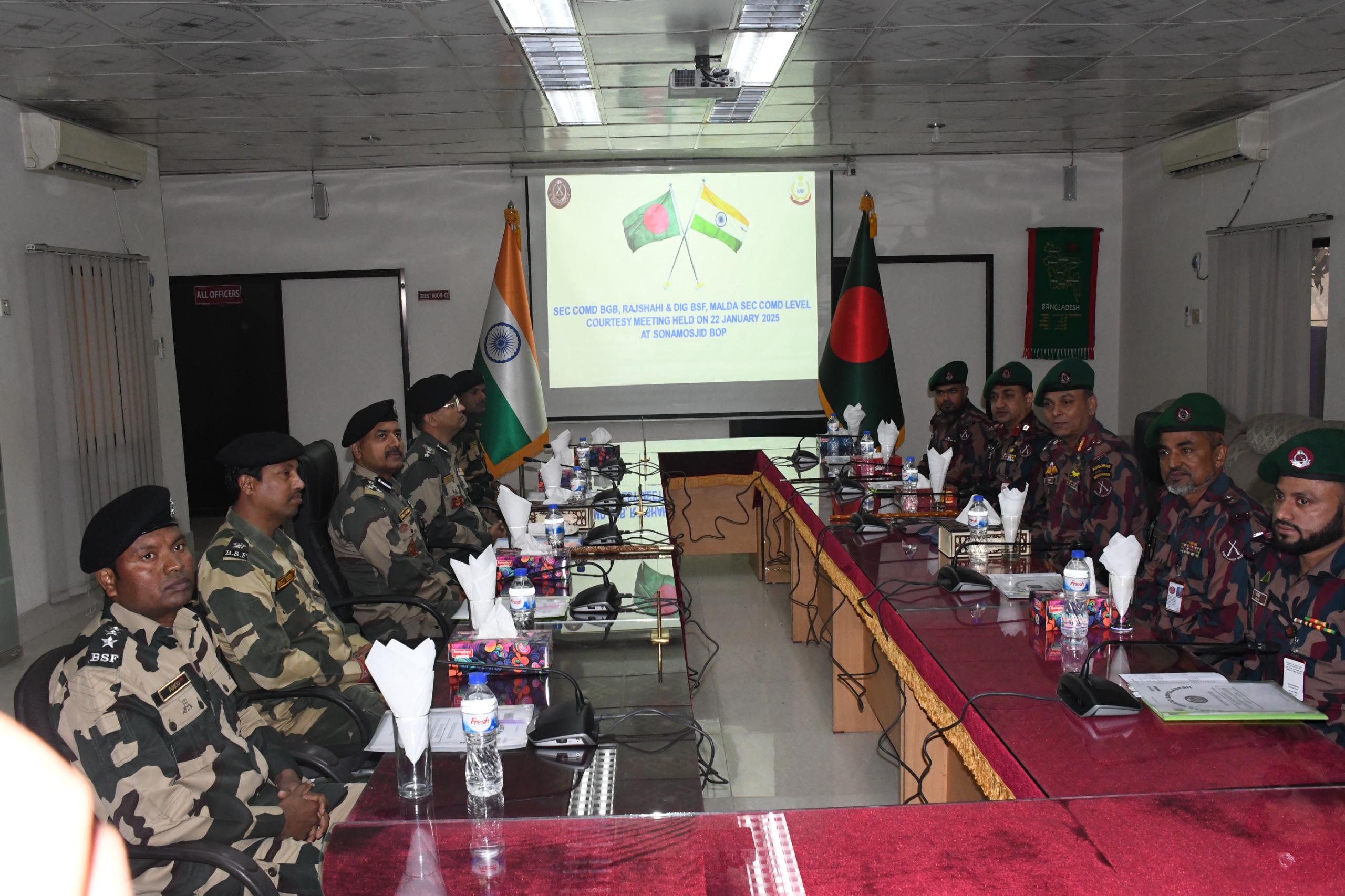 নিজস্ব সংবাদদাতা, মালদা, ২৩ জানুয়ারী,:—–বাংলাদেশের সোনামসজিদে বিওপি বিএসএফ মালদা সেক্টরের ডেপুটি ইন্সপেক্টর জেনারেল এবং বিজিবি রাজশাহী সেক্টরের সেক্টর কমান্ডারের মধ্যে একটি সীমান্ত সমন্বয় সভা অনুষ্ঠিত হয়। এই উচ্চ পর্যায়ের বৈঠক দ্বিপাক্ষিক সম্পর্ক জোরদার এবং আন্তর্জাতিক সীমান্তের পবিত্রতা নিশ্চিত করার প্রতি উভয় বাহিনীর অঙ্গীকারকে তুলে ধরে।