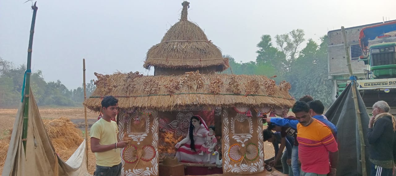 গ্রামীণ বাংলার ছেলে আব্দুল হাই তার পুজোর থিমে নিয়ে এসেছে পল্লী প্রকৃতির সবুজ ঘেরা গ্রামে মাটির কুঁড়েঘরে গ্রাম্য বধুরূপী সরস্বতী দেবীর।