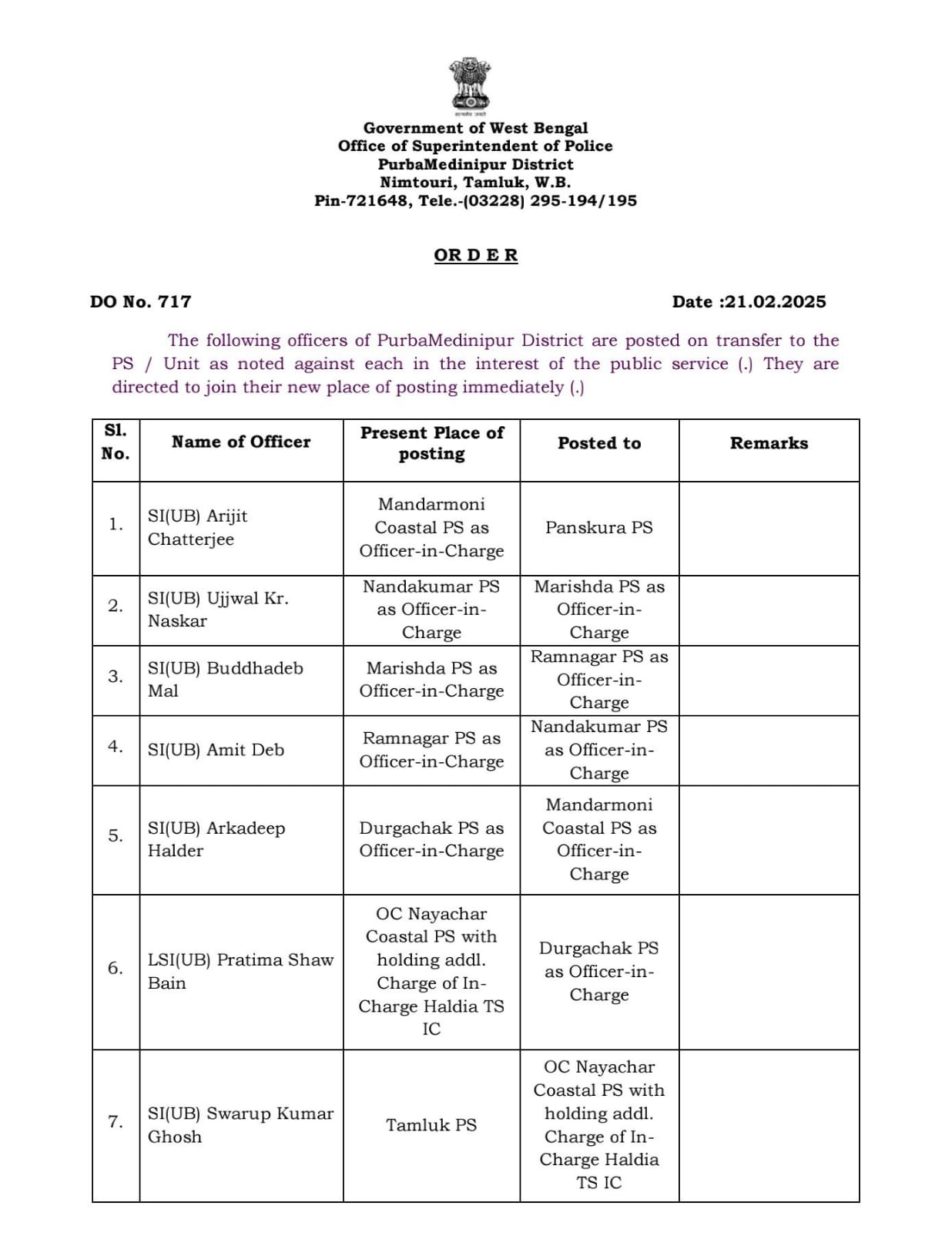 পূর্ব মেদিনীপুর জেলায় একাধিক থানায় ওসি ও সাব-ইন্সপেক্টরদের রদবদল।