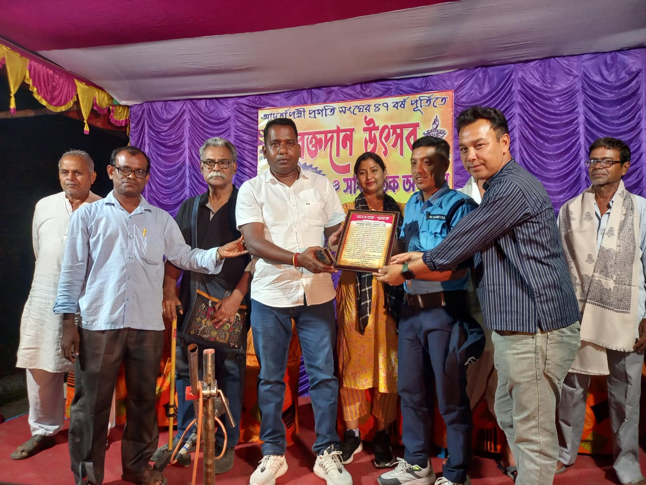 দঃ ২৪ পরগনা, নিজস্ব সংবাদদাতাঃ- দক্ষিণ ২৪ পরগনা জেলার ঘুটিয়ারি শরীফ আদর্শ পল্লী প্রগতি সংঘের উদ্যোগে সারাদিন ধরে চলে রক্তদান শিবির। এই রক্তদান শিবিরে মহিলা সহ পুরুষদের রক্তদানে ছিল চোখে পড়ার মত। রক্তদান শেষে চলে অঙ্কন প্রতিযোগিতা কবিতা আবৃত্তি শিল্পীদের নিয়ে গান নাটক সহ একাধিক কালচারাল প্রোগ্রাম। সেই সঙ্গে সন্ধ্যায় বিশিষ্ট ব্যক্তিদের উপস্থিতিতে ফারাজ আলী নামে ঘুটিয়ারি শরীফ পুলিশ ফাড়ির এক সিভিক ভলেন্টিয়ার ফারাজ আলী কয়েকদিন আগে পথ চলতি এক অসুস্থ মহিলাকে প্রানে বাঁচায়।ট্রেন আসার পাক মুহূর্ত রেল লাইনে পড়ে যায় ওই মহিলা । জীবনের বাজি রেখে ফারাজ আলী সেই মহিলাকে বাঁচিয়ে একেবারে চমকে দিয়েছে কয়েক হাজার মানুষকে। প্রত্যক্ষদর্শীরা বলে তুমি কি পাগল তুমি তো মরে যেতে পারতে। ফারাজ জালি সেদিন বলেছিল আমি তো মরে যাওয়ার জন্য জন্মেছি কিন্তু ওই মহিলা তো কারো মা। আমার চোখের সামনে দেখে আমি না থাকতে পেরে জীবনের বাজি রেখে রেললাইন থেকে উদ্ধার করি এটা আমার দায়িত্ব বলে মনে করি।