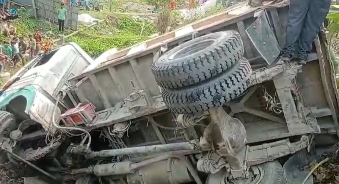 ফালাকাটা বীরপাড়া ১৭ নম্বর জাতীয় সড়কের ঢেনারপুল এলাকায় নয়ানজুলিতে উল্টে গেল বালি বোঝাই লরি।