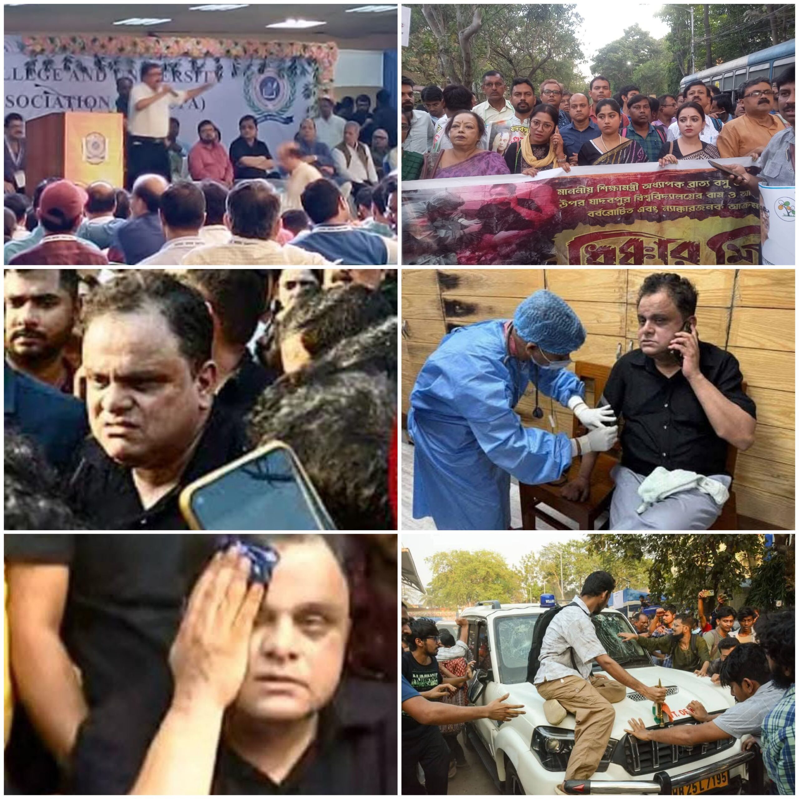 ঠিক ৩.১৫ নাগাদ শিক্ষামন্ত্রী বাইরে এসে সব ছাত্র সংগঠনের মাঝে এসে তাদের কথা শুনতে থাকেন। হঠাৎ করে ঐ চল্লিশ/ষাটের চক্র তীব্র ভাবে চিৎকার চেঁচামেচি করতে শুরু করে, নোংরা নোংরা খিস্তি দিতে থাকে, ভেতরে ডেপুটেশন দেওয়া সেই দুই SFI ছাত্রও হামলাতে যোগ দেয়,এই হামলা ও বচসায় ইন্দ্রানুজ রায়ও যোগ দেয়। তখন তারা শিক্ষামন্ত্রী ও আমাদের অধ্যাপকদের উপর চড়াও হয়। এই পরিস্থিতিতেও অধ্যাপকরা শান্ত থাকে। হঠাৎ করেই ব্রাত্য বসুর গায়ের উপর পড়ে হামলাকারীরা ধাক্কাধাক্কি শুরু করে । মন্ত্রী অসুস্থতা বোধ করেন এবং পাশেই বসে পড়েন, তখনও মন্ত্রী অপেক্ষা করতে থাকেন ওদের সাথে কথা বলার জন্য এবং সবাইকে শান্ত হতে বলেন।কে শোনে কার কথা, ওরা তখন মরিয়া, ইতিমধ্যে শিক্ষামন্ত্রীর গাড়ির বনেটে উঠে বাঁদরের মতো বেশ ক’জন লাফাতে থাকে। ইঁট দিয়ে গাড়ির কাঁচ ভাঙ্গতে থাকে, ভাঙা কাঁচের টুকরো শিক্ষামন্ত্রীর ডান চোখের নীচে লাগে,আর একটু হলেই বর্বরদের ছোঁড়া ইঁটে তার চোখ চিরতরে নষ্ট হয়ে যেতে পারতো।কোনমতে সভাপতি তথা শিক্ষামন্ত্রীকে বাঁচাতে গাড়ির ভেতর তুলে দেওয়া হয়,তোলার সময় তারা মন্ত্রীর হাতঘড়ি টানাটানি করে ছিনিয়ে নেয়। ইঁট দিয়ে গাড়ির কাঁচ ভাঙ্গতে শুরু করলে ভাঙা কাঁচের টুকরো ব্রাত্য বসুর চোখে লাগে, হঠাৎ করেই হুলিগান গুন্ডা, বর্বররা অধ্যাপকদের ধরে মারতে শুরু করে ,গবেষক ছাত্রদেরও পেটায়, WBCUPA-র সহ সভাপতিরা সহ ৩৭জন অধ্যাপক আহত হন, দুই অধ্যাপিকার শাড়ি ছিঁড়েছে তারা,এতটা বর্বর তারা। এরপর ৪.৩০:নাগাদ মাননীয় মন্ত্রী অসুস্থতা বোধ করলে , ড্রাইভার তাকে হসপিটালে নিয়ে যাওয়ার জন্য গাড়ি স্টার্ট করে। উল্টো দিক থেকে সেই নকশাল বীরপুঙ্গব ইন্দ্রানুজ গাড়ির পাশে এসেই স্কুটার থেকে ছিটকে পড়ে,ঐ হামলাবাজ ছাত্রছাত্রীদের ৩/৪জন তাকে গাড়ির গায়ে টেনে লাগিয়ে দিতে তৎপর হয়, মন্ত্রী ততক্ষণে চিকিৎসার জন্য SSKM হসপিটালের উদ্দেশ্যে রওনা দেন।