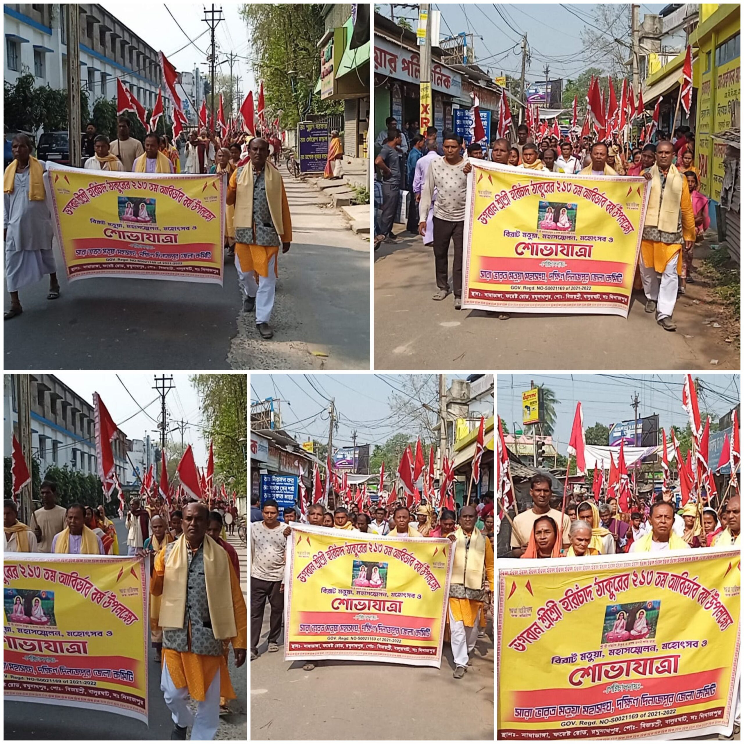 দঃ দিনাজপুর, নিজস্ব সংবাদদাতা :- ভগবান শ্রী শ্রী হরিচাঁদ ঠাকুরের ২১৩ তম আবির্ভাব বর্ষ উপলক্ষ্যে সারা ভারত মতুয়া মহাসংঘ দক্ষিণ দিনাজপুর জেলা কমিটির পরিচালনায় ও ব্যবস্থাপনায় বালুরঘাট শহরের রঘুনাথপুরে বিজয়শ্রীর নামাডাঙ্গাতে ১৯শে মার্চ বুধবার ও ২০শে মার্চ বৃহস্পতিবার দুইদিনব্যাপী বিরাট মাতুয়া মহাসম্মেলন মহোৎসব ও শোভাযাত্রা অনুষ্ঠিত হচ্ছে। আজ এই অনুষ্ঠানের দ্বিতীয় দিনে মতুয়া মহাসংঘের সদস্য ও ভক্তদের উপস্থিতিতে বিরাট ধর্মীয় শোভাযাত্রা শহর পরিক্রমা করে।