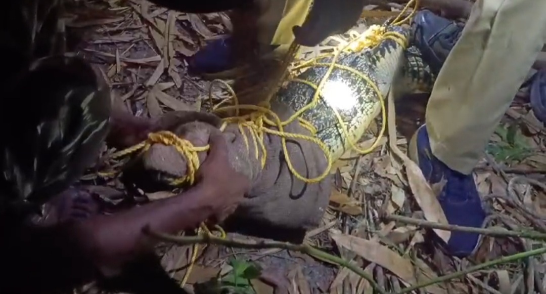নামখানার মৌসুনি দ্বীপের লোকালয়ে দেখা মিলল কুমিরের, বনকর্মীরা এসে উদ্ধার করল।