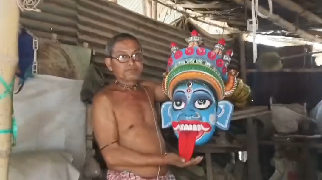 চড়ক পুজোর গাজনে নাচের জন্য ব্যবহৃত বিভিন্ন দেবদেবীর মুখোশ তৈরি করেন দক্ষিণ দিনাজপুরের বালাপুরের বাসিন্দা গণেশ বর্মন।