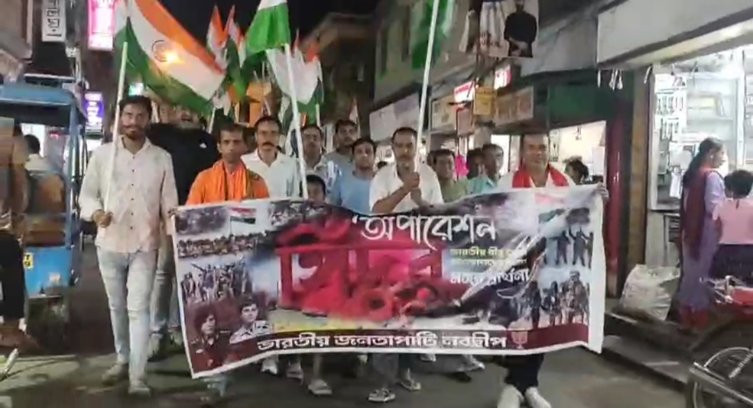 এদিন সন্ধ্যার পর শহর জুড়ে জাতীয় পতাকা হাতে নিয়ে পাকিস্তানের বিরুদ্ধে একাধিক স্লো দিয়ে মিছিল করে শহরের আরাধ্য দেবী মা পোড়ামা মন্দিরে দেশের সেনা জওয়ানের মঙ্গল কামনায় পুজো দেয় এর পর পুনরায় মিছিল করেই নবদ্বীপ থানায় গিয়ে পৌরপতির নামে লিখত অভিযোগ দায়ের করে বিজেপি।