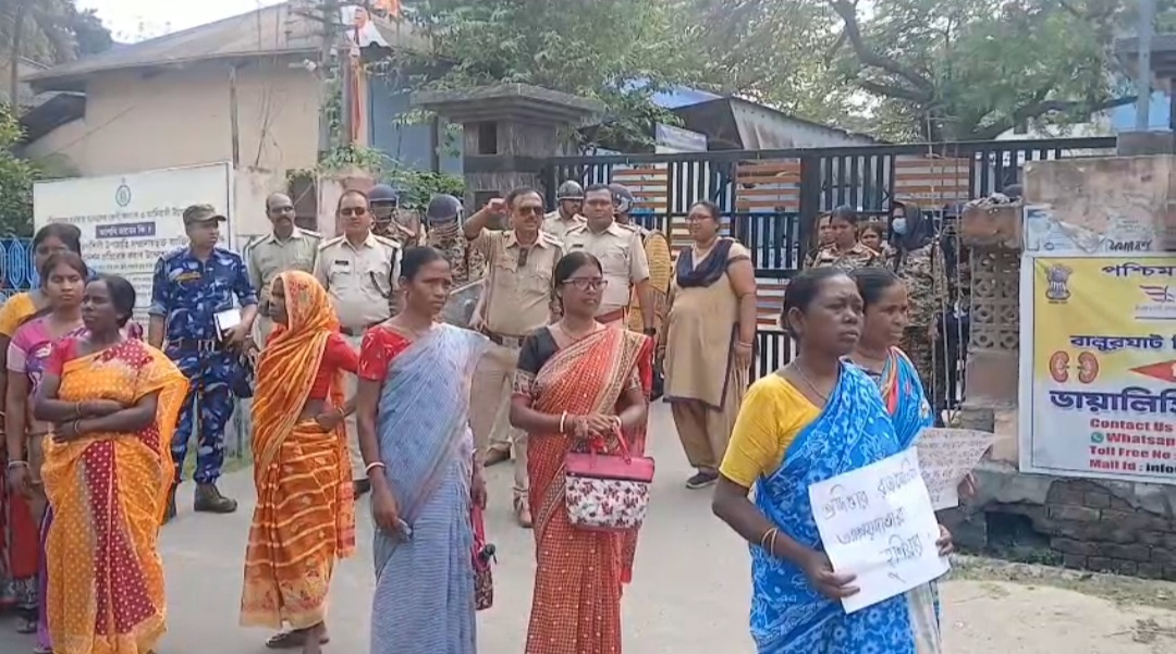বালুরঘাটে জেলা প্রশাসনিক ভবনের সামনে আদিবাসী সমন্বয় কমিটির ডাকে আদিবাসি শ’দুয়েক মহিলা পুরুষ পথ অবরোধ করে বিক্ষোভে সামিল হন।