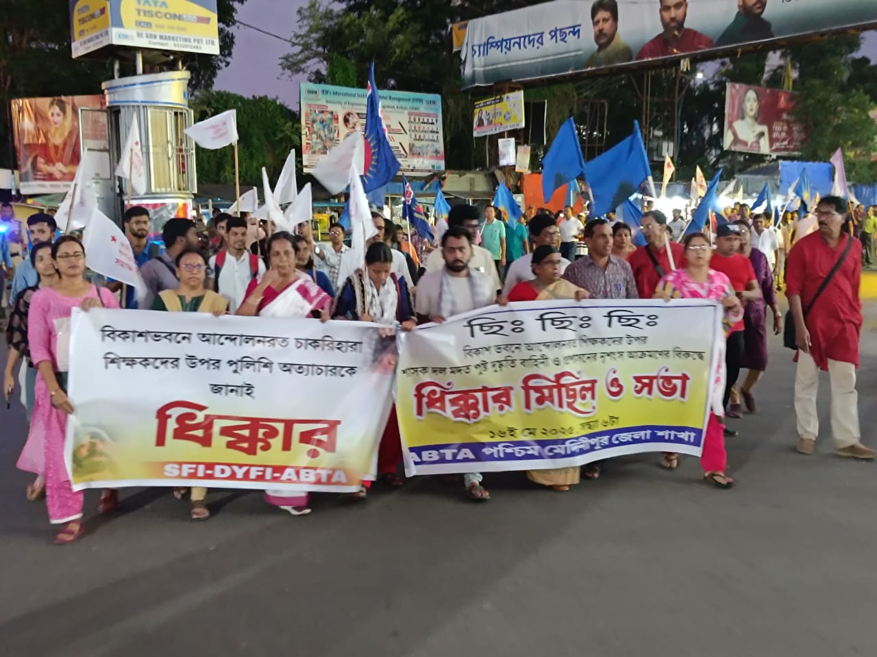 পশ্চিম মেদিনীপুর, নিজস্ব সংবাদদাতাঃ- কলকাতার বিকাশ ভবনে চাকরিহারা শিক্ষক-শিক্ষিকাদের অবস্থান বিক্ষোপে পুলিশী অত্যাচারের বিরুদ্ধে প্রতিবাদ জানিয়ে শুক্রবার সন্ধ্যায় পশ্চিম মেদিনীপুর জেলার মেদিনীপুর শহরের রবীন্দ্রনগর থেকে ধিক্কার মিছিলের আয়োজন করল বাম সংগঠনের ছাত্র সংগঠন, ছাত্র-যুব সংগঠন এবং শিক্ষক সংগঠনের সদস্যরা, এই দিন এই ধিক্কার মিছিল গোটা শহর পরিক্রমা করে, এই দিন এইদিককার মিছিলে কয়েকশো কর্মী সমর্থক পা মিলিয়েছেন, প্রসঙ্গত গতকাল অর্থাৎ বৃহস্পতিবার কলকাতার বিকাশ ভবনের সামনেই চাকরিহারা শিক্ষক শিক্ষিকদের অবস্থান বিক্ষোভ চলাকালীন অত্যাচার চালায় পুলিশ প্রশাসন এমনটাই অভিযোগ বাম সংগঠনের।