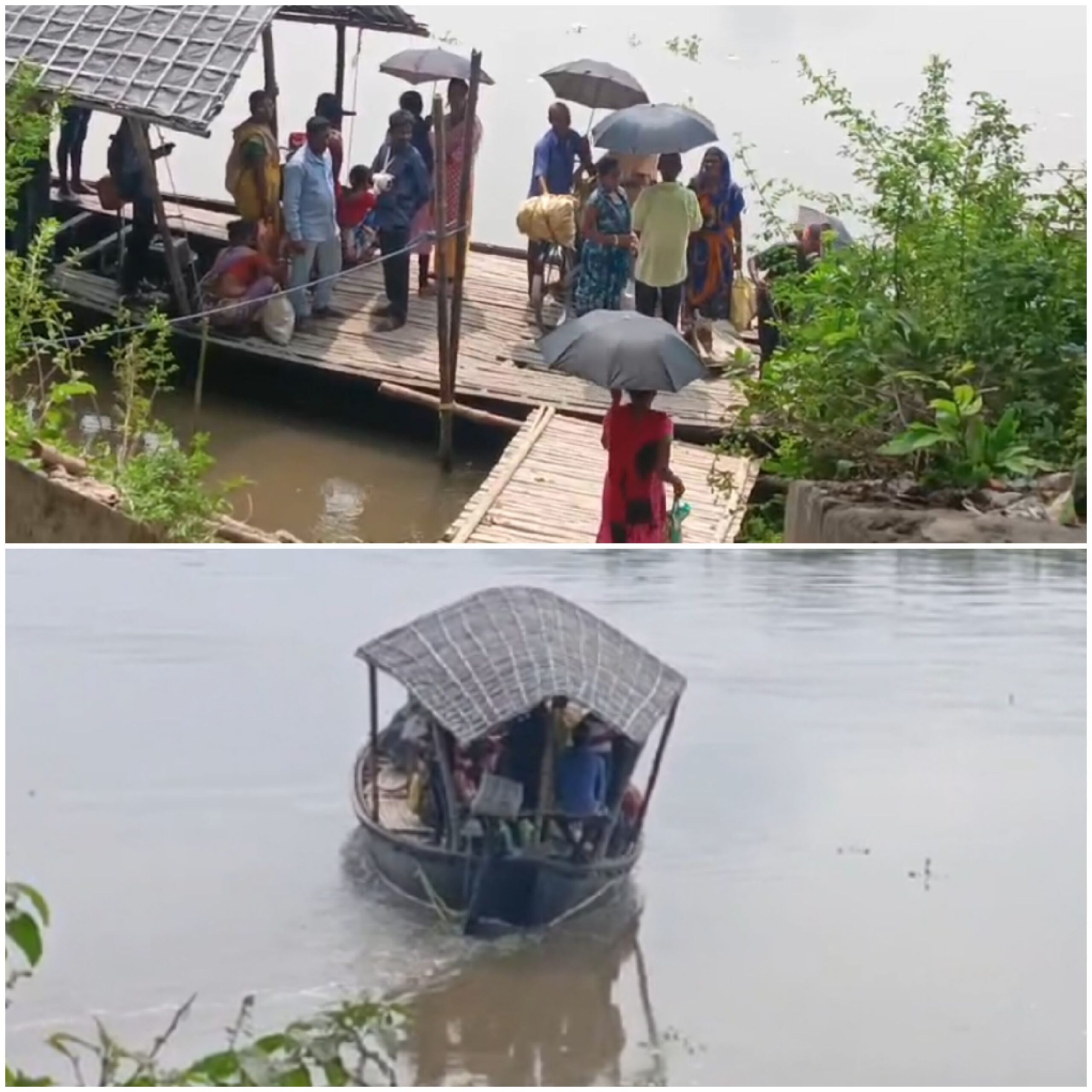 বালুরঘাট, দক্ষিণ দিনাজপুর, নিজস্ব সংবাদদাতা :- আত্রেয়ী নদীর উপর বাঁশের সাঁকো ভেঙে যাওয়ায় সমস্যার সম্মুখীন কালিকাপুর সহ কয়েকটি গ্রামের বাসিন্দারা। হঠাৎ করে আত্রেয়ী নদীর জলস্তর বেড়ে যাওয়ায় হুরমুরিয়ে ভাসিয়ে নিয়ে যায় চলাচলের একমাত্র বাঁশের সাঁকো। এই সাঁকোর মাধ্যমেই কালিকাপুর, বোয়ালদার, ডাকরা কলোনি সহ বেশ কিছু গ্রামের মানুষের বালুরঘাট শহরের রঘুনাথপুর এর সাথে যোগাযোগের একমাত্র মাধ্যম ছিল। দীর্ঘদিন পাকা সেতুর দাবি করেও, পাকা সেতু মেলেনি। ফলে বাঁশের সেতু দিয়েই বালুরঘাট জেলা হাসপাতাল, স্কুল সহ শহরের সাথে যোগাযোগ ছিল। হঠাৎ জল বেড়ে যাওয়ায়, বাঁশের সাঁকো ভেসে যাওয়ায়, এখন ভরা নদীতে ঝুঁকিপূর্ণ ভাবে নৌকায় পারাপার হতে হচ্ছে। সমস্যা সমাধানে দ্রুত পাকা সেতুর দাবীতে সরব হয়েছেন এলাকার বাসিন্দারা।