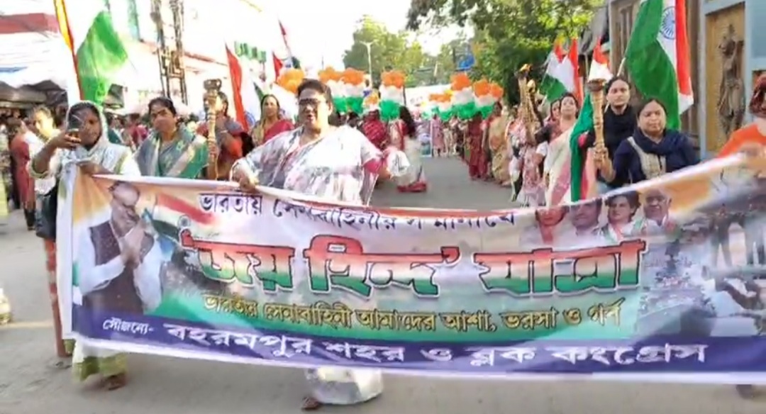 মুর্শিদাবাদ, নিজস্ব সংবাদদাতা:- ভারতীয় সেনাবাহিনীর বীর পরাক্রম কে কুর্নিশ জানিয়ে আজ মুর্শিদাবাদের বহরমপুরে কংগ্রেস পার্টি অফিসের সামনে থেকে একটি বিশাল জয় হিন্দ সভা যাত্রা বের করা হয়। এই জয় হিন্দ শোভা যাত্রায় প্রদেশ কংগ্রেসের ওয়ার্কিং কমিটির সদস্য অধীর রঞ্জন চৌধূরী অংশ গ্রহন করেন । 350 ফুট জাতিয় পতাকা নিয়ে এই শোভা যাত্রা করা হয়। বহরমপুরে শহর পরিক্রমা করে। এই পদযাত্রার শেষে একটি সভা করে যেখানে আমাদের দেশের সেনাবাহিনী ও তার পরিবার দের সন্মান করা হবে বলে জানালেন।