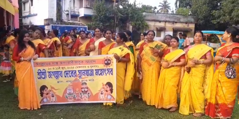 দক্ষিণ দিনাজপুর, নিজস্ব সংবাদদাতা:- আজ শ্রী শ্রী জগন্নাথ দেবের স্নানযাত্রা উপলক্ষ্যে গতকাল বিকেলে জগন্নাথ দেবের ভক্তদের উপস্থিতিতে বালুরঘাটের আত্রেয়ী নদী থেকে পরিক্রমা করে জল আনয়নের মধ্য দিয়ে বালুরঘাট প্রাচ্যভারতীর মাঠে দুইদিনব্যাপী শ্রী শ্রী জগন্নাথ দেবের স্নানযাত্রা মহোৎসবের শুভ সূচনা হয়েছে, গতকাল বিকেলে আত্রেয়ী নদী থেকে আনয়নের পাশাপাশি সন্ধ্যারতি, ভাগবত পাঠ ও জগন্নাথ দেবের অধিবাস হয়েছে। আজ ভোরে মঙ্গলারতি ও পুজোর পাশাপাশি মহা অভিষেক, দুপুরে ভোগারতি এবং মহাপ্রসাদ বিতরণ করার ব্যবস্থা করা হয়েছে। এছাড়াও সন্ধ্যায় বিরাট ধর্মীয় অনুষ্ঠানের আয়োজন করা হয়েছে। মহোৎসবের বিষয়ে বিস্তারিত শুনে নেব বালুরঘাট পৌরসভার ২২ নম্বর ওয়ার্ডের পৌর প্রতিনিধি প্রদীপ্তা চক্রবর্তীর কাছ থেকে —