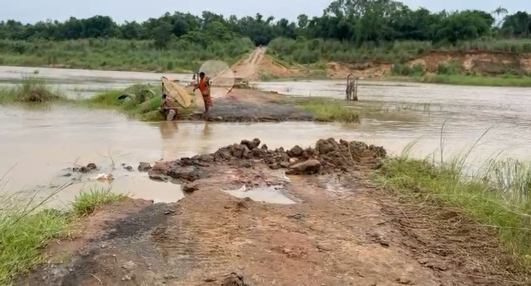 জলের তোড়ে ভেঙে বীরভূমের মহম্মদবাজার থেকে বড়াম সহ ১২ টি গ্রাম যাওয়ার নদীর উপর অস্থায়ী রাস্তা।