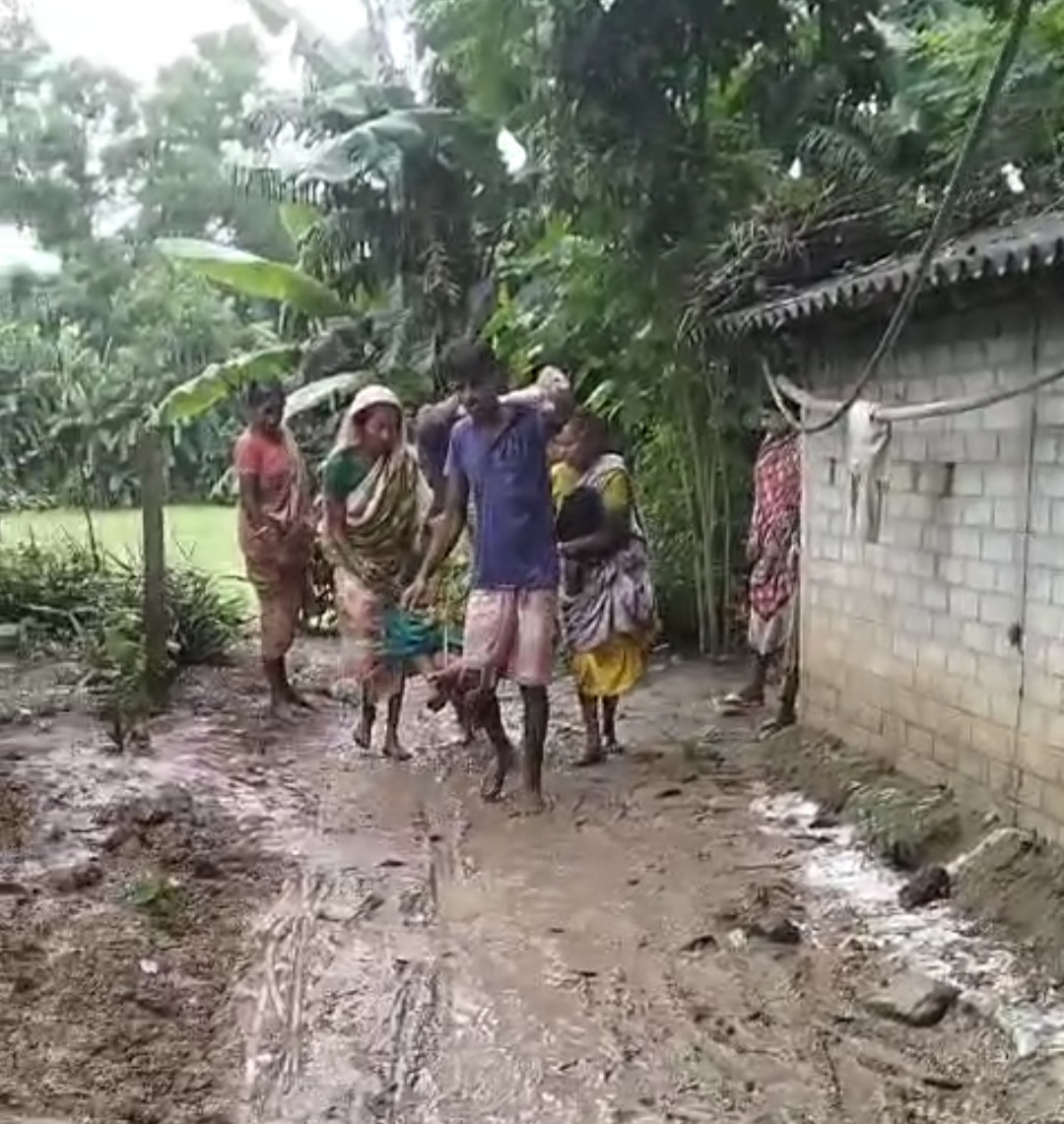 পশ্চিম মেদিনীপুর, নিজস্ব সংবাদদাতা:- রাস্তার অবস্থা বেহাল তাই অসুস্থ মহিলাকে ঝোলাই করে নিয়ে আসা হচ্ছে মূল রাস্তায়। এই ছবি দেখতে হল পশ্চিম মেদিনীপুর জেলাতে। অভিযোগ পশ্চিম মেদিনীপুর জেলার নারায়ণগড় ব্লকের নারায়ণগড় 2 নম্বর গ্রামরাজ অঞ্চলের সানদেউলি গ্রামে ঢোকার রাস্তা । প্রায় ৭০০ মিটার রাস্তার অবস্থা এমনই খারাপ সেই রাস্তা দিয়ে যাতায়াত করায় দুর্বিষহ। অসুস্থ হয়ে পড়লে বর্ষাকালে বা বৃষ্টি হলে তাকে এভাবেই নিয়ে আসতে হয় বলেই অভিযোগ। সান দেউলি গ্রামের বাসিন্দা ৬৫ বছরের সরস্বতী সামট হাটের পেশেন্ট। হঠাৎ তিনি অসুস্থ হওয়ায় গ্রাম থেকে মেন রাস্তা অব্দি বের করে নিয়ে আসতে হচ্ছে ঠিক এভাবেই । তারা নিজের ছেলে এবং গ্রামের ছেলেরা একত্রিত হয়ে ঝোলাই করে ঝুলিয়ে অসুস্থ ভদ্রমহিলাকে নিয়ে আসছেন মেইন রোড অব্দি । কেননা টানা বৃষ্টিতে গ্রামের ঢোকার রাস্তা একরকম প্রায় বন্ধ । ওই এলাকায় প্রায় ২৫ থেকে ৩০ টি এস সি সম্প্রদায়ের মানুষ বসবাস করেন বলেই দাবি ওই এলাকার বাসিন্দার ।