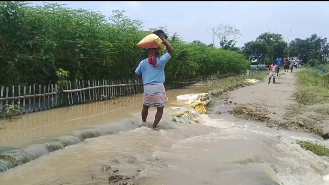 রাস্তা কেটে ঢুকছে গঙ্গার জল, মানিকচকের গোপালপুরে বন্যার আশঙ্কা।
