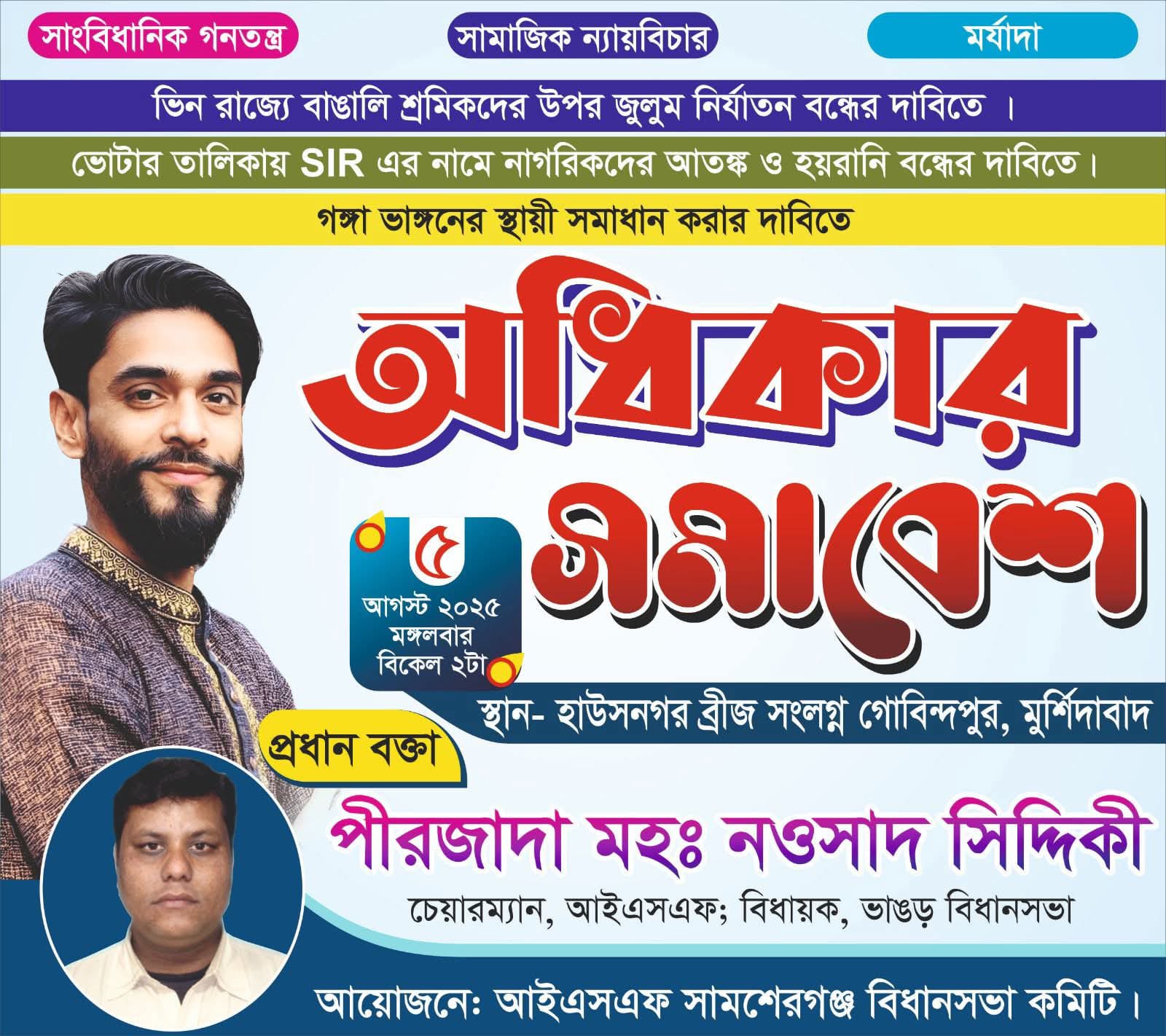 মুর্শিদাবাদ, নিজস্ব সংবাদদাতা:- আগামীকাল সামশেরগঞ্জে অনুষ্ঠিত হতে চলেছে ISF-এর ‘অধিকার সমাবেশ’। এই গুরুত্বপূর্ণ কর্মসূচিতে অংশ নিতে আসছেন ISF চেয়ারম্যান ও রাজ্যের একমাত্র ISF বিধায়ক নওশাদ সিদ্দিকী। সমাবেশের আসর বসছে সামশেরগঞ্জের হাউসনগর ব্রিজের পাশে গোবিন্দপুরে।