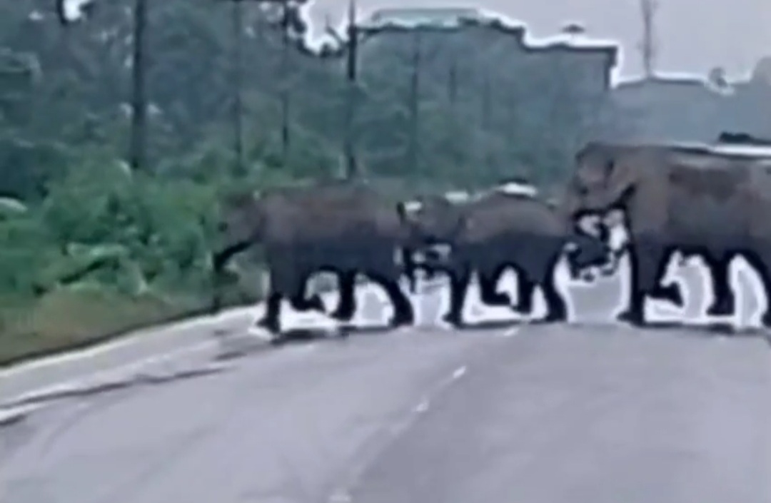এশিয়ান হাইওয়েতে বুনো হাতির দল, বনকর্মীদের তৎপরতা।