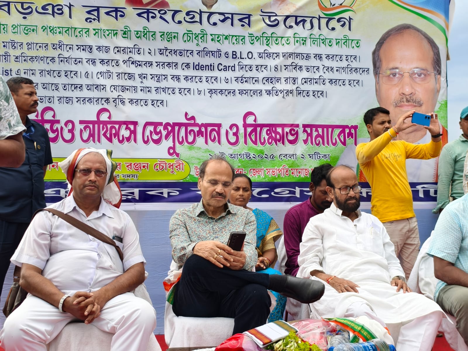 বড়ঞা, মুর্শিদাবাদ, নিজস্ব সংবাদদাতা :- কান্দি মাস্টার প্ল্যান সংস্কার, বালিখাটে অবৈধ কাজ বন্ধ, পরিযায়ী শ্রমিকদের সুরক্ষা এবং রাজ্যে ক্রমবর্ধমান সন্ত্রাসের প্রতিবাদে আজ বড়ঞা ব্লক কংগ্রেসের পক্ষ থেকে স্থানীয় বিডিও অফিসের সামনে এক বিক্ষোভ সমাবেশ ও ডেপুটেশন কর্মসূচি পালিত হয়েছে। এই কর্মসূচিতে উপস্থিত ছিলেন প্রাক্তন সাংসদ শ্রী অধীর রঞ্জন চৌধুরী।