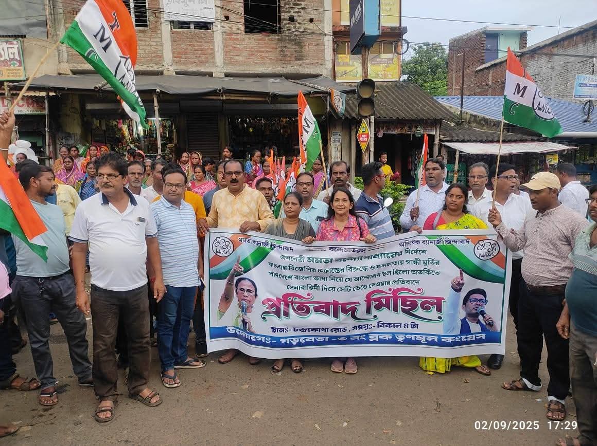 পশ্চিম মেদিনীপুর, নিজস্ব সংবাদদাতা:- কলকাতার ধর্মতলায় গান্ধী মুক্তির পাদদেশে বাংলা ভাষা নিয়ে সপ্তাহে দুই দিন আন্দোলন করেছিল তৃণমূল, বিজেপি চক্রান্ত করে সেই আন্দোলন স্থল সেনাবাহিনী দিয়ে খুলে দেওয়ার অভিযোগ তুলে বিজেপির বিরুদ্ধে মুখ্যমন্ত্রী মমতা বন্দ্যোপাধ্যায়ের নির্দেশ অনুসারে রাজ্যের প্রত্যেকটি ব্লকে চলছে প্রতিবাদ মিছিল করছে তৃণমূল, সেই পূর্ব ঘোষিত কর্মসূচি অনুযায়ী মঙ্গলবার বিকেলে পশ্চিম মেদিনীপুর জেলার গড়বেতা তিন নম্বর ব্লক তৃণমূল কংগ্রেসের ডাকে চন্দ্রকোনারোড শহরে প্রতিবাদ মিছিল করলো তৃণমূল নেতা কর্মীরা, এই দিন ব্লক তৃণমূল দলীয় কার্যালয় থেকে এই মিছিল বেরিয়ে গোটা শহর পরিক্রমা করে শহরের প্রাণকেন্দ্রে অর্থাৎ চৌরাস্তার মোড়ে প্রতিবাদ সাভার মধ্যে দিয়ে শেষ হয় এই প্রতিবাদ কর্মসূচি,এই দিন উপস্থিত ছিলেন ব্লক তৃণমূল কংগ্রেসের সভাপতি বিশ্বজিৎ সরকার, ব্লক সভানেত্রী দীপা লাহা, সাগর মন্ডল, সুশান্ত সিংহ সহ অন্যান্য ব্লক ও অঞ্চলের নেতাকর্মীরা।