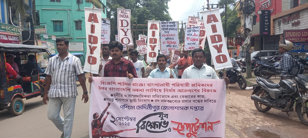 বাংলাভাষী শ্রমিকদের উপর অত্যাচারের প্রতিবাদে মেদিনীপুরে AIDYO’র বিক্ষোভ।