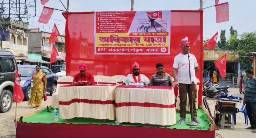 নিজস্ব সংবাদদাতা, মালদাঃ- —আর ওয়াই এফ এর আহ্বানে অধিকার যাত্রা, সোমবার দুপুরে বামনগোলা ব্লকের পাকুয়াহাটি এলাকায় অনুষ্ঠিত হলো অধিকার যাত্রা,এই অধিকার যাত্রা শুরু হয় ৩১শে আগস্ট, কোচবিহারের মেখলিগঞ্জ থেকে শেষ হবে ১৫ ই সেপ্টেম্বর কলকাতায় গিয়ে।অধিকার যাত্রায় পাকুয়াহাট এলাকায় একটি র্যালি মাধ্যমে গোটা এলাকা পরিক্রমা করে বামনগোলা বিডিও অফিস মোড়ে একটি পথসভা করা হয়।আর ওয়াই এফ সদস্যরা বক্তব্য রাখতে গিয়ে বক্তব্য রাখতে গিয়ে কেন্দ্র ও রাজ্যকে কটাক্ষ করে বলেন,যুবক-যুবতীদের মাসিক ৩০ হাজার টাকার রোজগারের গ্যারান্টি চাই। কৃষিভিত্তিক ও কর্মসংস্থান সৃষ্টিকারী শিল্পায়ন চাই।স্বচ্ছতার সাথে সকল সরকারী গুণ্যপদে স্থায়ী নিয়োগ করতে হবে।নদী ভাঙ্গনে ক্ষতিগ্রস্ত মানুষদের ক্ষতিপূরণ-স্থায়ী পুনর্বাসন ও ভাঙ্গন প্রতিরোধ করতে হবে।বাংলা ভাষা ভাষী পরিযায়ী শ্রমিকদের দেশের যেকোনো রাজ্যে কাজ করাও বসবাস করা সংবিধান সম্মত অধিকার।সহ বিভিন্ন বিষয় বক্তব্যের মধ্যে তুলে ধরে। এদিন উপস্থিত ছিলেন আর ওয়াই এফ রাজ্য সম্পাদক আদিত্য জোরদার, আর ওয়াই এফ সর্বভারতীয় সম্পাদক রাজীব ব্যানার্জি, আর ওয়াই এফ জেলা সম্পাদক অমিত সাহা, আর ওয়াই এফে জেলা সভাপতি সুশীল মার্ডি