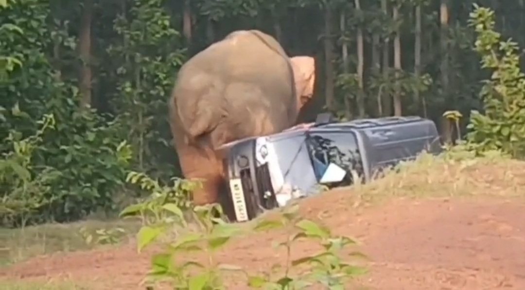শালবনীর জঙ্গলে হাতির হামলা, ক্ষতিগ্রস্ত চার চাকা গাড়ি।