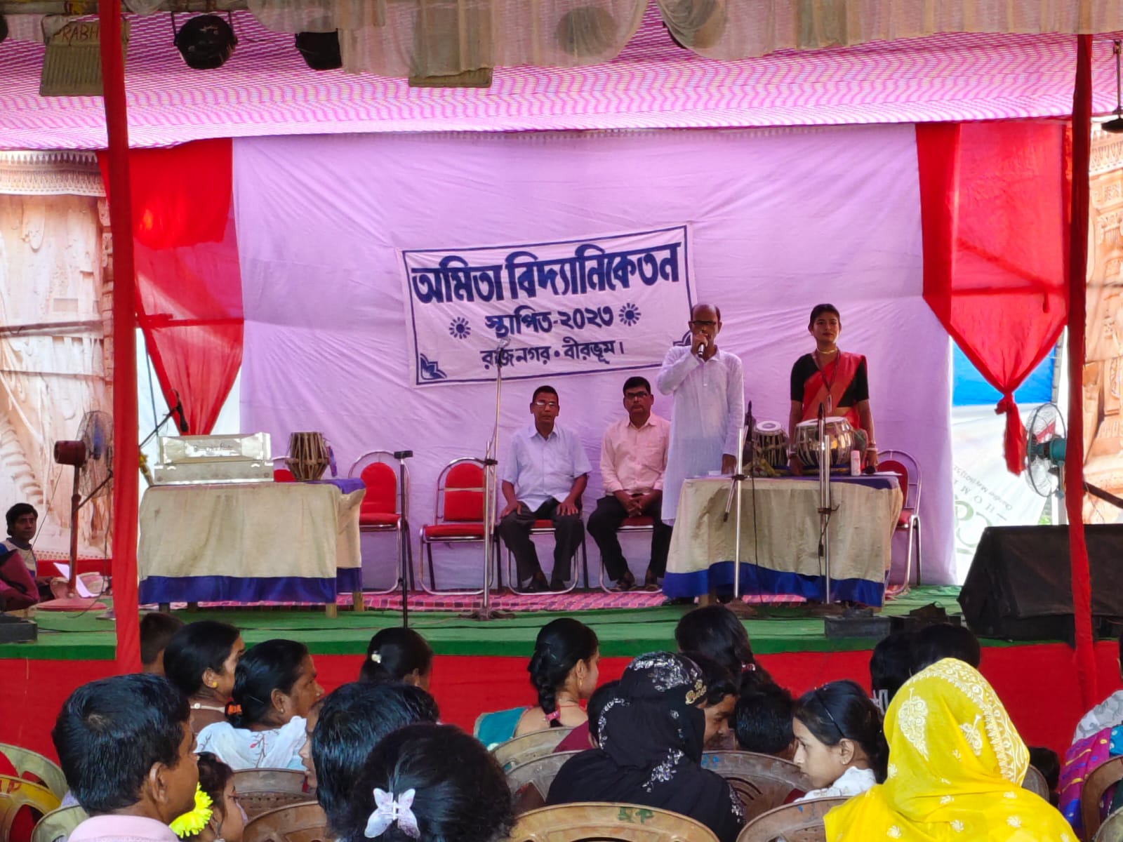বীরভূম, নিজস্ব সংবাদদাতাঃ- বীরভূম জেলা রাজনগর খাসবাজারে সৎসঙ্গ প্রাঙ্গণে অমিতা বিদ্যানিকেতন বিদ্যালয়ের বার্ষিক সাংস্কৃতিক অনুষ্ঠান আয়োজিত হয়৷ মঞ্চে উপস্থিত ছিলেন বিশিষ্ট অতিথিরা৷ সভায় সভাপতিত্ব করেন অবসরপ্রাপ্ত শিক্ষক বিনয় চৌধুরী৷ প্রধান অতিথির আসন অলংকৃত করেন শিক্ষক বিমানচন্দ্র ভান্ডারী৷ স্বাগত বক্তব্য রাখেন বিদ্যালয়ের প্রধান শিক্ষক ঠাকুরদাস ভান্ডারী৷ মঞ্চে অতিথিদের বরণ, উদ্বোধনী সংগীত, বক্তব্য,কচি কাঁচাদের ছড়া, কবিতা, নৃত্যানুষ্ঠান, সংগীত, নাটক প্রভৃতি পরিবেশিত হয়৷ সিউড়ি থেকে আগত অলোক নৃত্য কলা একাডেমির পক্ষ থেকে অলোক ঘোষ দস্তিদারের নেতৃত্বে একাডেমির ছাত্র ছাত্রীদের নৃত্যানুষ্ঠান এদিন অনুষ্ঠানে ভিন্ন মাত্রা আনে৷ অনুষ্ঠান সঞ্চালনায় ছিলেন সাংবাদিক সফিউল আলম ও বিদ্যালয়ের শিক্ষিকা সুদেষ্ণা মন্ডল৷ বিদ্যালয়ের শিক্ষক, শিক্ষিকা, শিক্ষাকর্মীদের তৎপরতা ছিল যথেষ্ট৷ উপস্থিত সকলকে রাত্রিকালীন আহারে আপ্যায়িত করা হয়৷ এমন উদ্যোগের প্রশংসা করেন অভিভাবক সহ অনেকে৷
