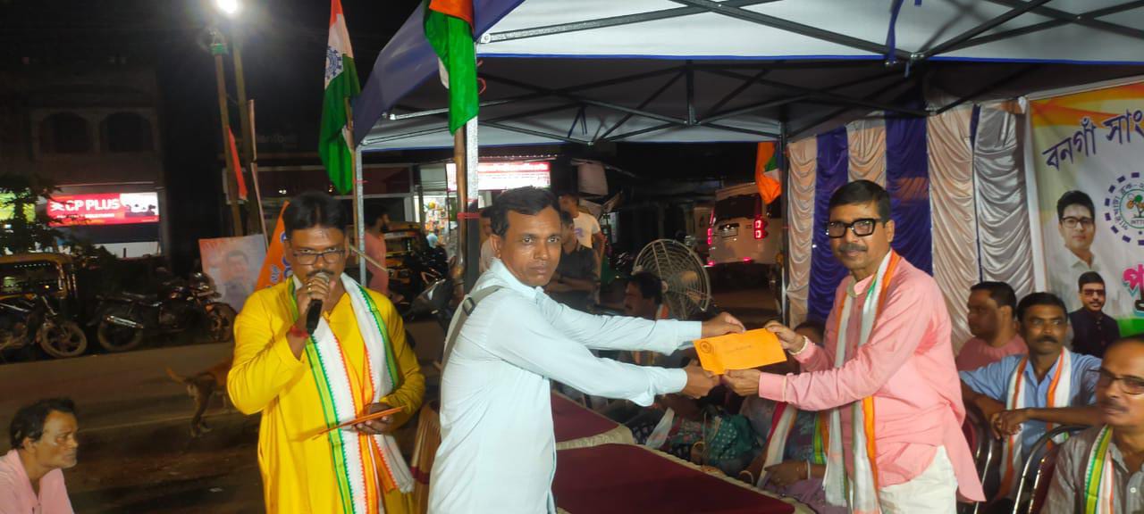 পূজা প্রাক্কালে শ্রমিকদের মাঝে বোনাস বিতরণ, উপস্থিত তৃণমূল ও পঞ্চায়েত নেতৃত্ব।
