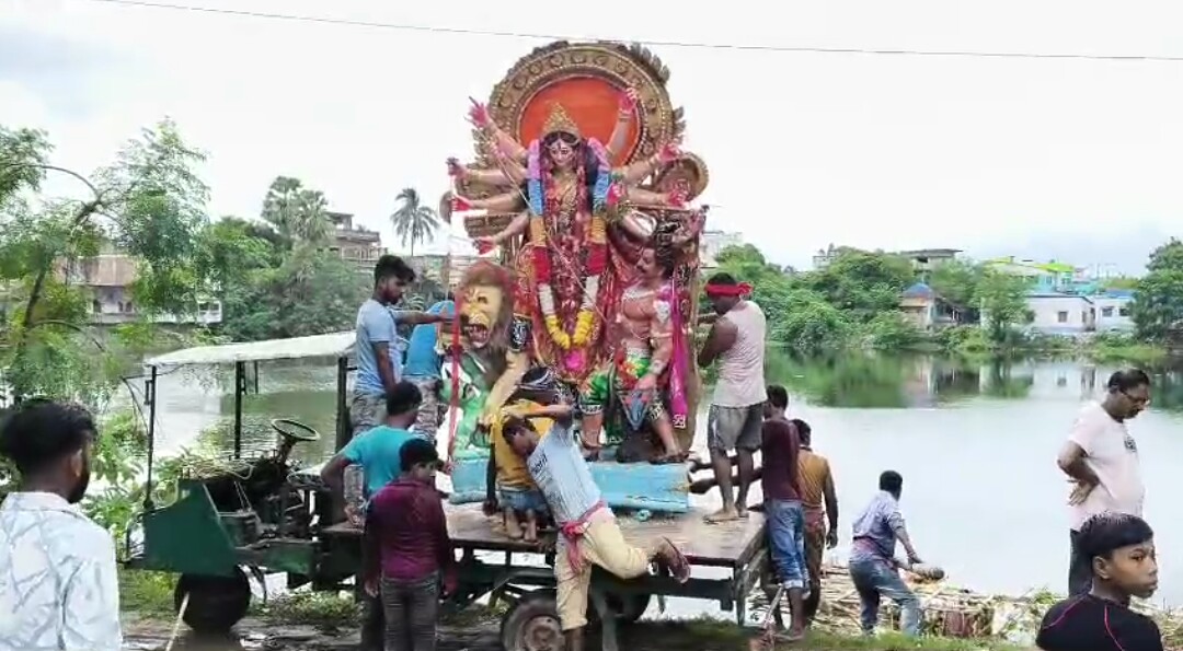 বর্ণাঢ্য শোভাযাত্রার মধ্য দিয়ে গাজোলে বিধানপল্লী সার্বজনীন দুর্গোৎসব কমিটির প্রতিমা নিরঞ্জন।