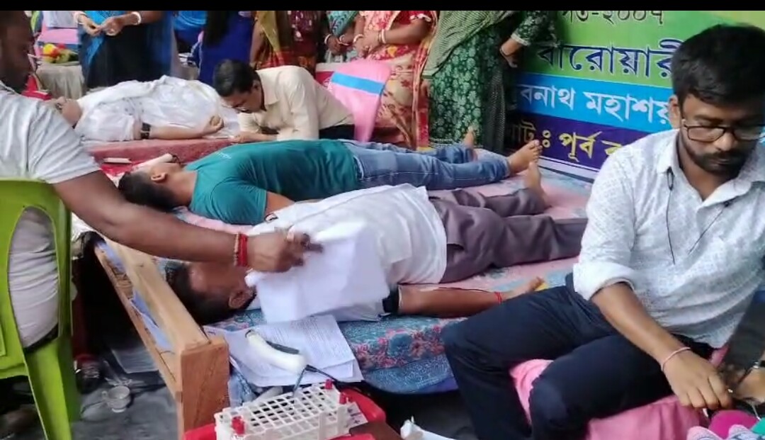 ধোবা ঐক্য বারোয়ারীর উদ্যোগে রক্তদান ও বস্ত্রদান শিবিরে উৎসবের আমেজ — উপস্থিত মন্ত্রী স্বপন দেবনাথ।