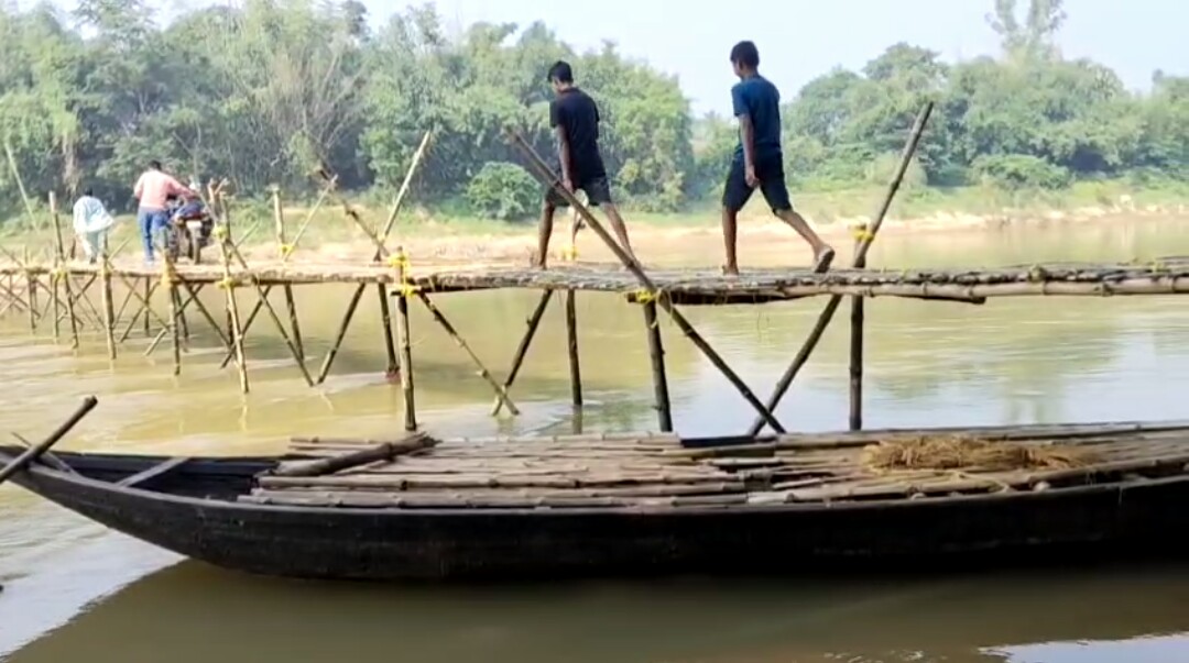 শিলাবতী নদীর উপর বাঁশের সাঁকো গড়ে তুলল নিত্যানন্দপুরের মানুষ, প্রশাসনের নিষ্ক্রিয়তায় ক্ষোভ।