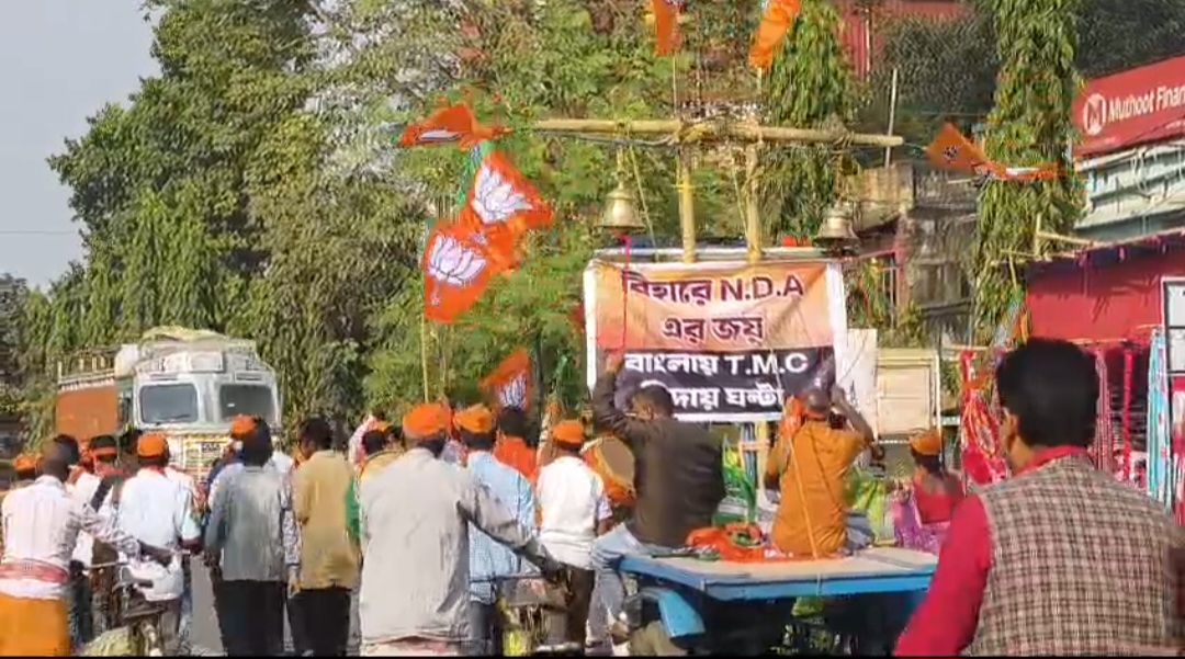 বিহার জয়ে উচ্ছ্বাস: চন্দ্রকোনা রোডে বিজেপির ঢাক-বাজনা ও লাড্ডু বিলি।