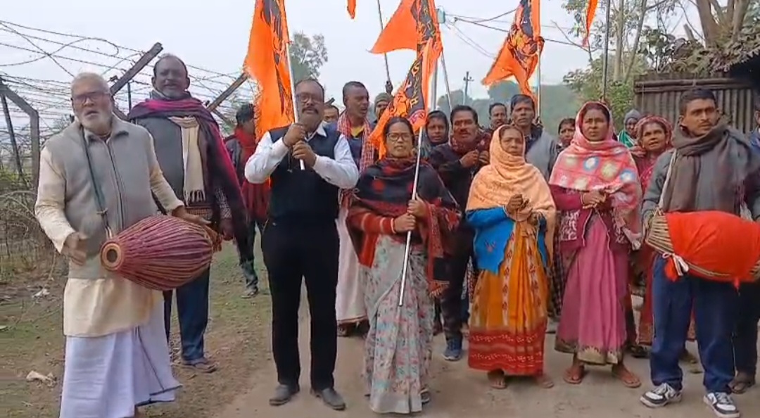 দিপু দাস হত্যার প্রতিবাদে ভারত-বাংলাদেশ সীমান্তে খোল–করতাল হাতে স্লোগান।
