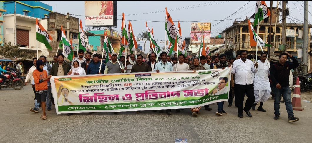 পশ্চিম মেদিনীপুর, নিজস্ব সংবাদদাতা:- জাতীয় ভোটার দিবসের দিনেই কেন্দ্রীয় সরকারের বিরুদ্ধে তীব্র প্রতিবাদে শামিল হল তৃণমূল কংগ্রেস। রবিবার পশ্চিম মেদিনীপুর জেলার কেশপুর ব্লক তৃণমূল কংগ্রেসের ডাকে কেশপুর বাজার এলাকায় এক বিশাল প্রতিবাদ মিছিল অনুষ্ঠিত হয়।