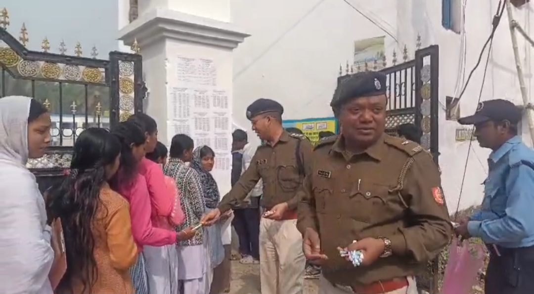 পরীক্ষা কেন্দ্র ঘুরে ছাত্রছাত্রীদের শুভেচ্ছা জানালেন এএসপি, পাশে আইসি তরুণ কুমার রায়।