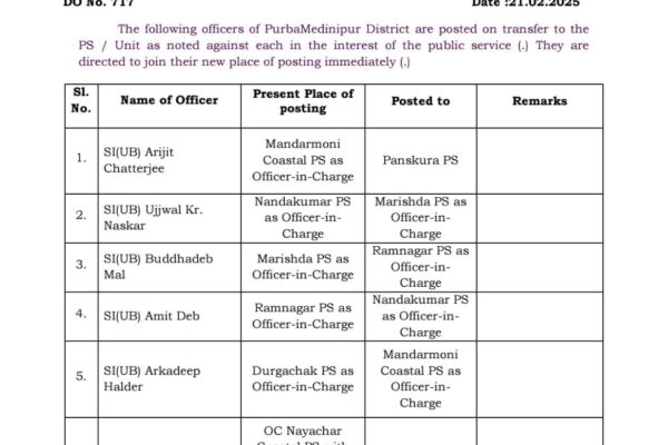 পূর্ব মেদিনীপুর জেলায় একাধিক থানায় ওসি ও সাব-ইন্সপেক্টরদের রদবদল।
